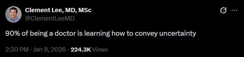 Which is why the most important skill in these situations is not plugging numbers into an actuarial table, but communicating what is known and what is not. The physician’s role is to synthesize the limited data, clinical experience, standards of care, and patient-specific factors, then convey that uncertainty honestly. That includes acknowledging tradeoffs, eliciting patient values, and arriving at a shared decision.
